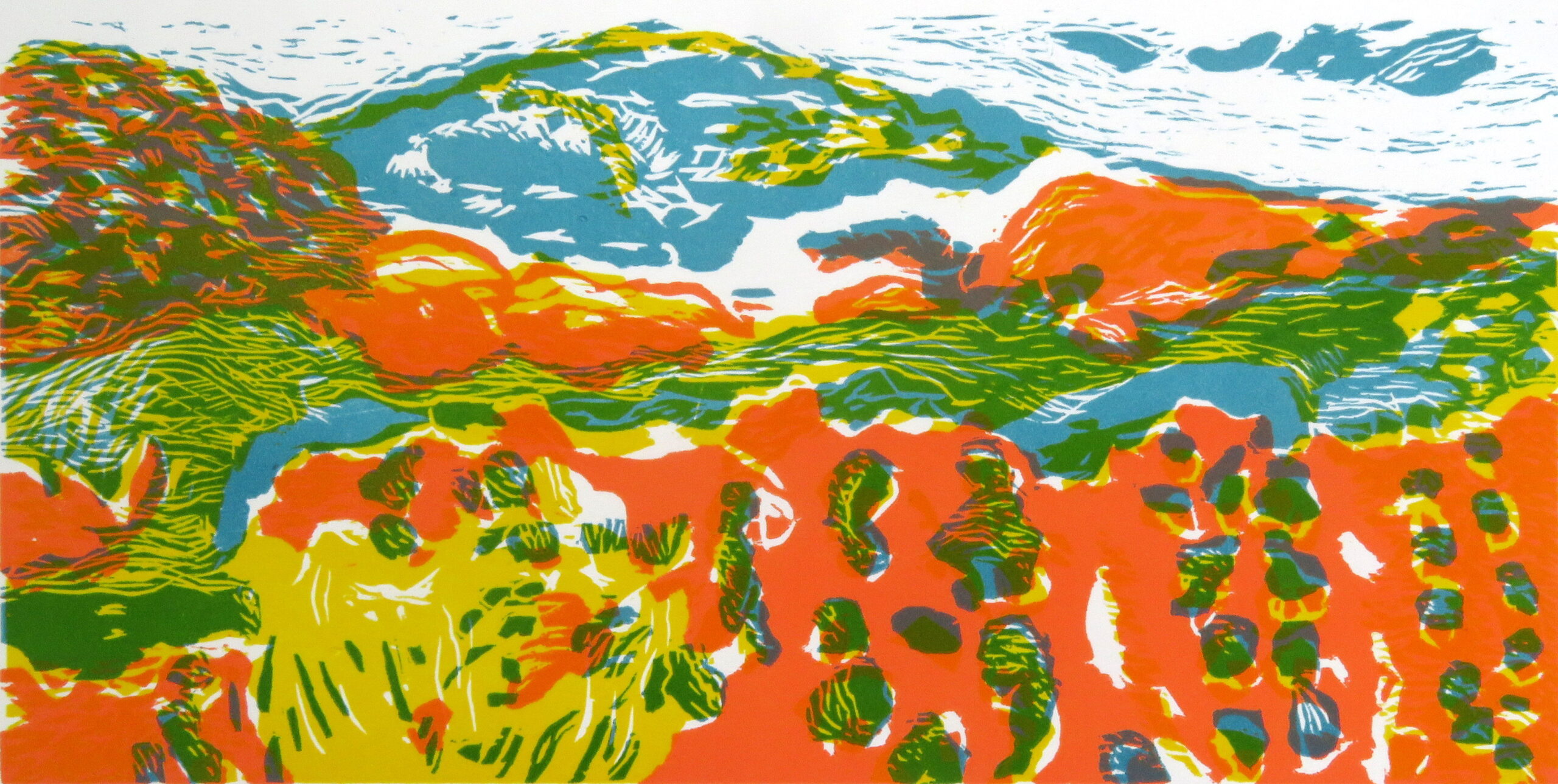 Morar, Schotland | 15 x 30 cm | japans plywood op Zerkall Bütten 250 grams | 3 kleuren drukinkt | oplage 12 Na de reis, een met doos met 6 prenten en gedichten. En 6 losse prenten